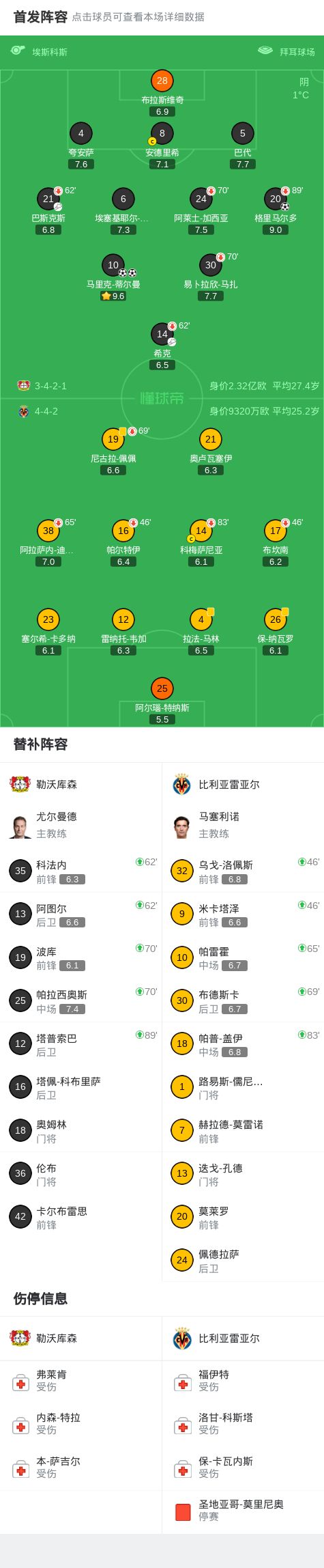 勒沃库森3-0大胜比利亚雷亚尔,马里克-蒂尔曼双响,格里马尔多建功